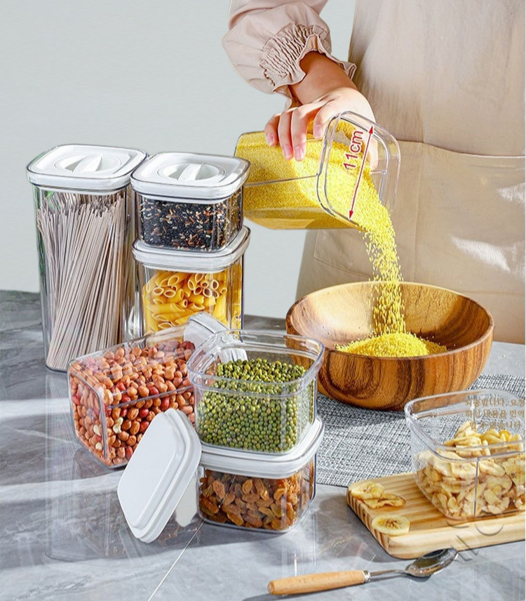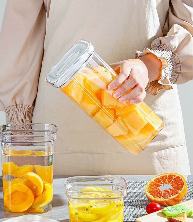 Rotating transparent sealed jar keeps food fresh and visible. Space-saving design, easy to access and organize kitchen essentials. Durable material, airtight lid, suitable for grains, snacks, and spices.